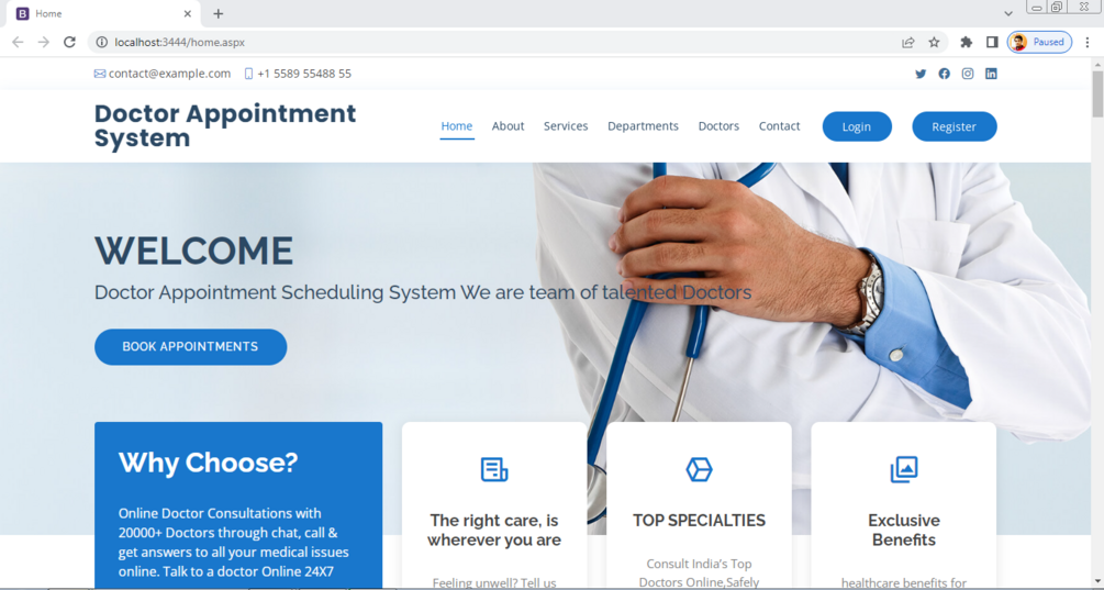 Doctor Appointment Scheduling Website ASP.NET Project with SQL Server & Report Documentation.
